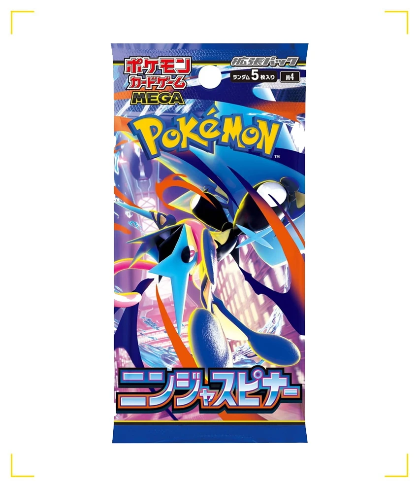 Oryginalne japońskie karty Pokemon z serii Ninja Spinner (M4), wydanej 13 marca 2026 r. w Japonii. Zestaw wprowadza między innymi Mega Greninja ex oraz inne nowe Mega Pokemon ex, a karty z tej serii będą następnie pojawiać się w angielskiej edycji Chaos Rising w maju 2026. Oryginalny japoński booster z kartami PokémonTCG.